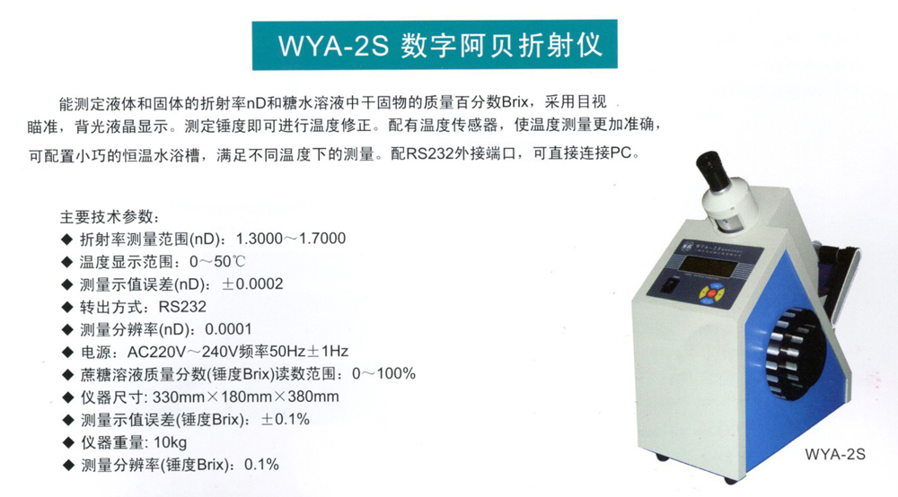 1、测定液体或固体的折射率nD和糖水溶液中干固物的百分含量及Brix锤度,采用目视瞄准,数显读数,测定锤度时可进行温度修正,配有RS232接口,可向PC机传送数据